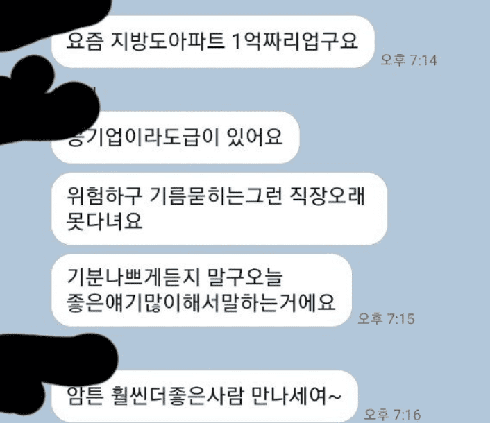 소개팅녀는 자존심을 끝까지 지키려 “요즘 지방도 아파트 1억짜리는 없고, 공기업이라도 급이 있어요”라며 “위험하고 기름 묻히는 그런 직장은 오래 못다녀요”라고 충고를 했다.