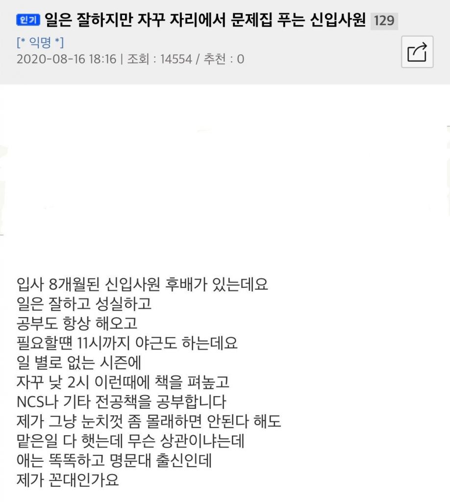 해당 글은 ‘일은 잘하지만 자꾸 자리에서 문제집 푸는 신입사원’이란 제목으로 올라왔다.