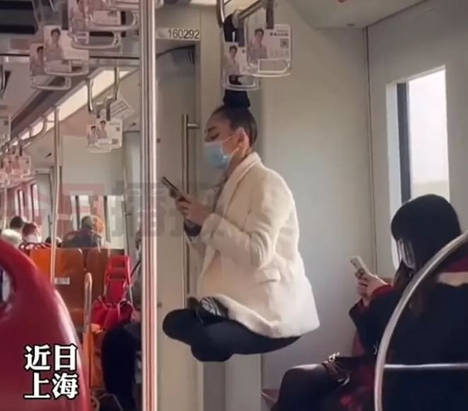 지난 20일 중국 매체 소상신부 웨이보 계정에는 지하철 손잡이에 머리카락을 묶어 공중에 떠 있는 한 여성 승객의 모습을 알렸다.
