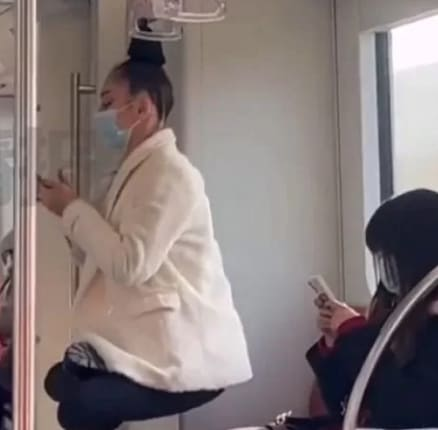 의자에는 승객들이 모두 자리를 차지하고 있어 빈 곳이 없었는지 머리카락이 긴 한 여성이 자신의 머리카락을 손잡이에 묶은 다음 매달려 있었다.