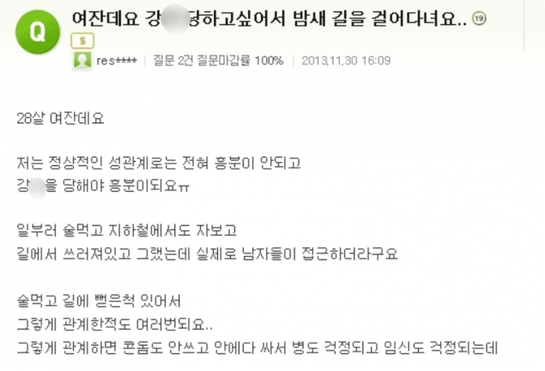 네이버 질문 글을 올릴 수 있는 지식in에 한 여성 A씨는 ‘여잔데요 강X 당하고 싶어서 밤새 길을 걸어다녀요’라는 제목의 글을 네이버 지식in에 올렸다.