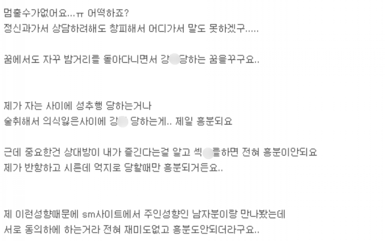 A씨는 자신을 먼저 28살 여성이라 밝히면서 “정상적인 성관계로는 전혀 흥분이 안되고 강X을 당해야 흥분이 된다”라고 전해 많은 이들의 눈을 의심하게 만들었다.