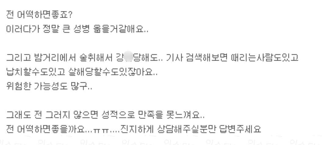 마지막으로 A씨는 “어떡하면 좋겠냐. 이러다가 큰 성병 옮을 것 같아서 걱정된다”며 “진지하게 상담해주실 분만 답변 부탁드린다”고 했다.