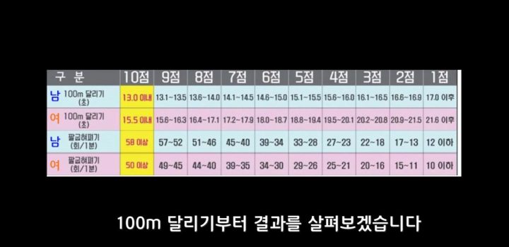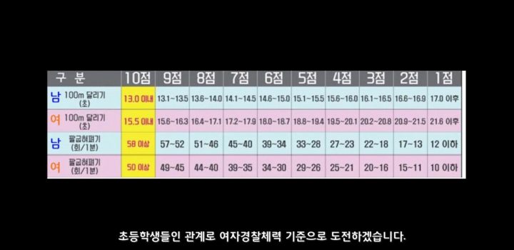 우리 경찰은 체력검사에서 총 5개 종목으로 지원자의 신체적 능력을 측정한다. ▶100m 달리기 ▶1000m 달리기 ▶윗몸일으키기 ▶좌우 악력 ▶팔굽혀펴기다. 종목당 10점이 만점이다. 총점 최고점수는 50점이다. 남녀 간 점수 기준은 다르다.