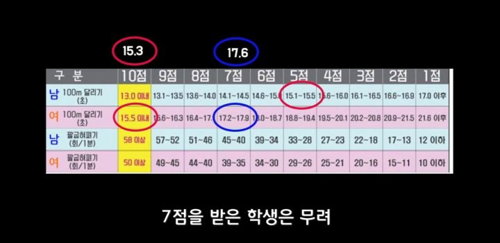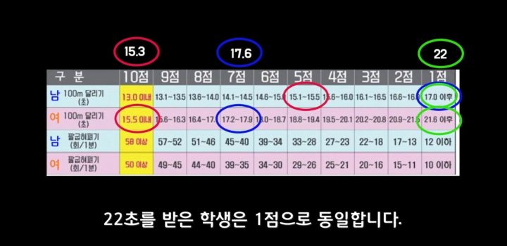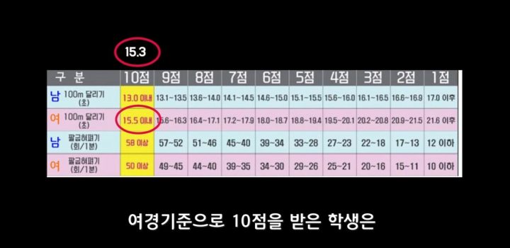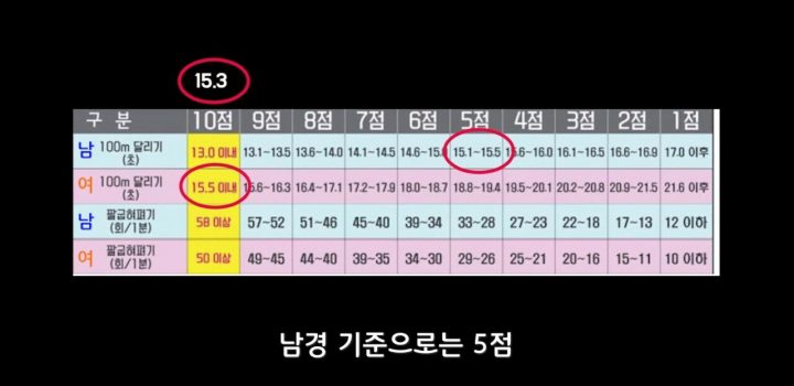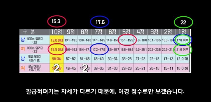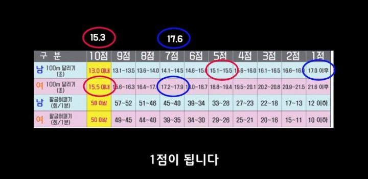 여성 기준으로 1000m 달리기에서 턱걸이로 만점을 따더라도 남성 기준으로는 1점이며 경찰 체력검사에선 한 종목이라도 1점을 얻으면 불합격이다.