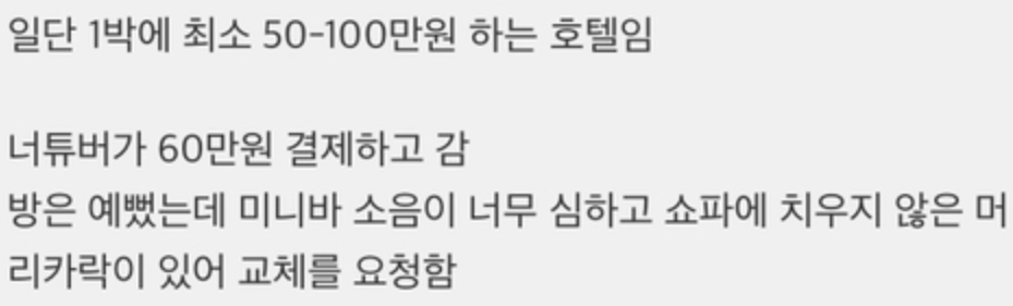 그리고 한 유튜버가 60만원 결제를 하고 갔는데 소음이 너무 심하고 쇼파에 치우지 않은 머리카락도 발견해 교체를 요청했다고 한다.