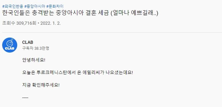 지난 2일 유튜브 채널‘CLAB’에는 ‘한국인들은 충격받는 중앙아시아 결혼 세금(얼마나 예쁘길래…)’라는 제목의 영상이 게시되었다.