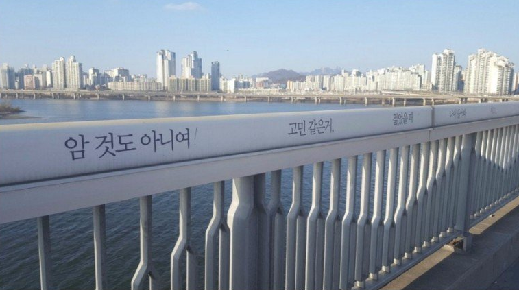 한편, 2012년 서울시는 한강다리 중 투신율 1위인 마포대교 난간에 시민 공모로 받은 ‘자살방지문구’를 써넣는 프로젝트를 실시한 바 있다.