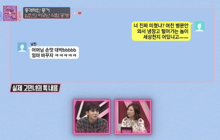 이에 B씨는 “왜? 아끼는 거야?”라며 “어머님 손맛 대박. 엄마 바꾸자”라는 황당한 답변을 늘어놓았다.