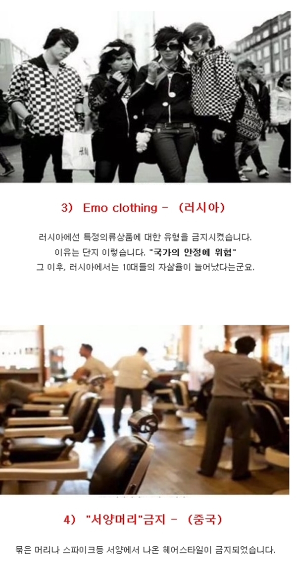 개인의 패션이나 헤어스타일을 제재하는 법이 러시아와 중국에 있었다.