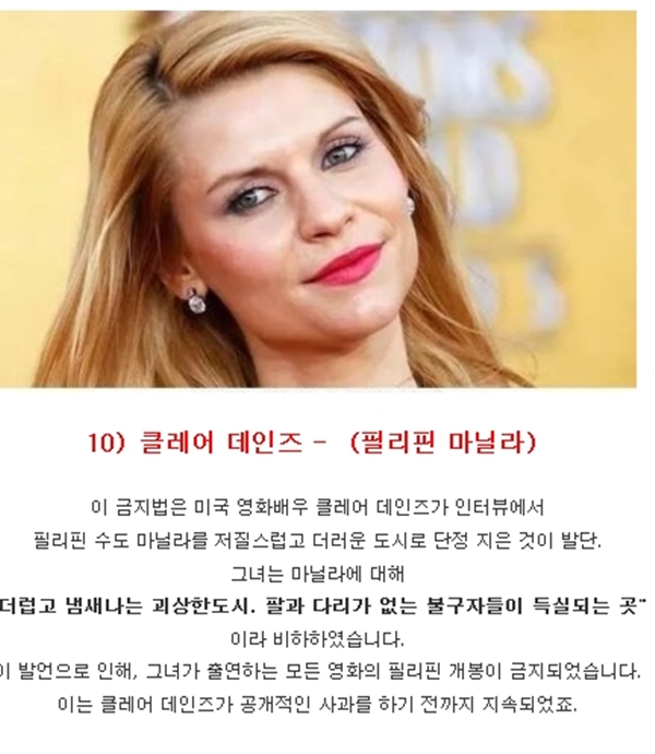 미국 영화배우 클레어 데인즈가 필리핀의 수도 마닐라를 저질스럽고 더러운 도시로 단정짓자, 그녀가 출연하는 모든 영화의 필리핀 개봉이 금지되기도 했었다고 했다.
