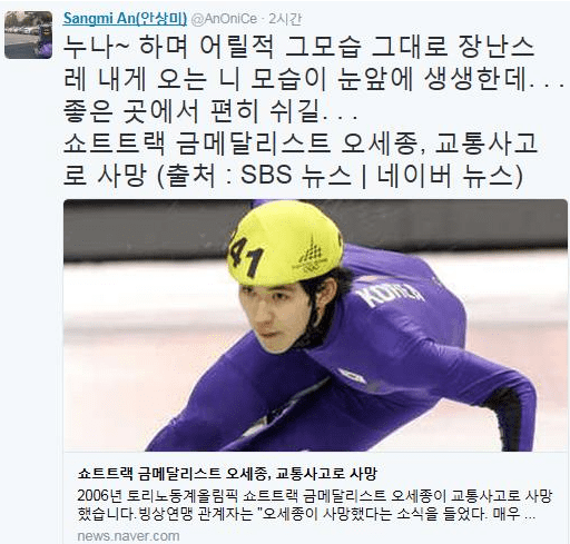 지난 2016년 6월, 2006 토리노 동계올림픽 쇼트트랙 금메달리스트 오세종(34)이 안타까운 교통사고로 세상을 떠나게 됐다.