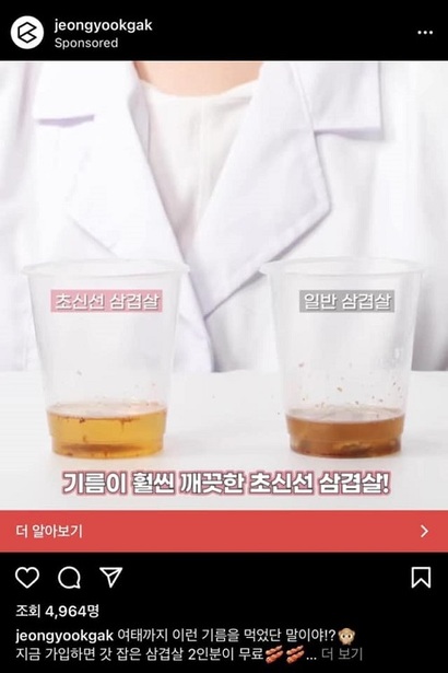 그런데 일반 삼겹살의 기름과 초신선 삼겹살의 기름 색깔이 큰 차이가 없었던 것이다.