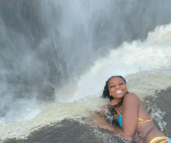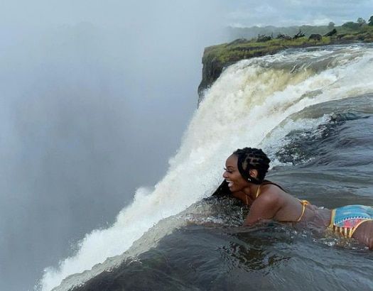 로즈는 어깨가 절벽 바깥으로 나갈 정도로 데빌스 풀의 가장자리까지 다가가서 팔을 폭포 아래로 쭉 뻗으며 아찔한 포즈를 취하고 있다.