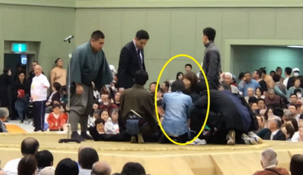 아나운서 여성은 “여성은 씨름판(도효·土俵)에서 내려 와달라”며 여러번 반복했다.