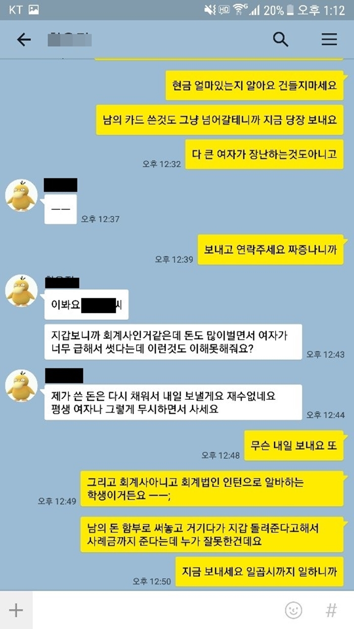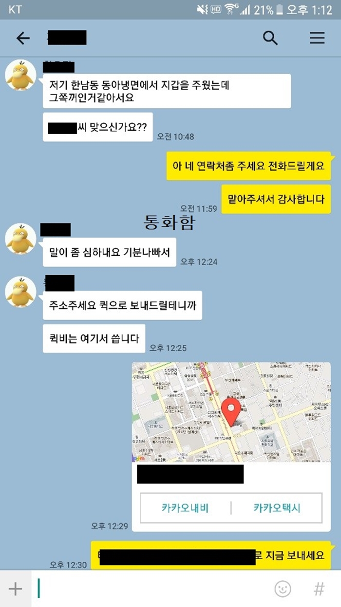 일방적으로 통화가 끝난 후 A씨는 카톡을 계속 했는데 지갑을 주운 여성은 알아서 할 테니 카톡 보내지 말라”는 카톡을 남겼다.