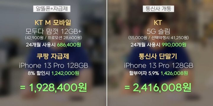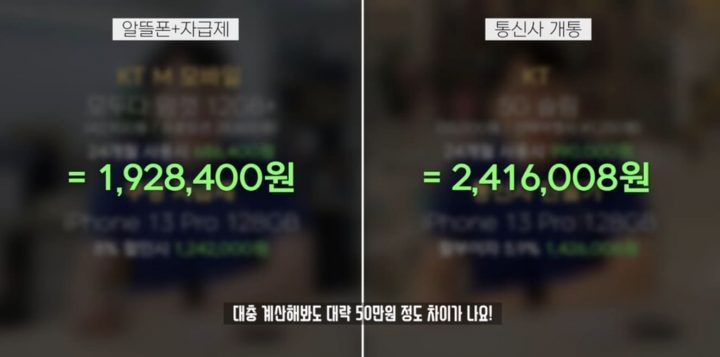 그 후 잇섭은 “비슷한 요금제로 비교하자면 이렇다”라며 ‘알뜰폰 + 자급제’ 조합과 통신사 개통했을 때의 가격을 보여주며 “금액이 어마어마하게 차이 난다. 대충 계산해봐도 대략 50만 원 정도 차이가 난다”라고 설명했다.