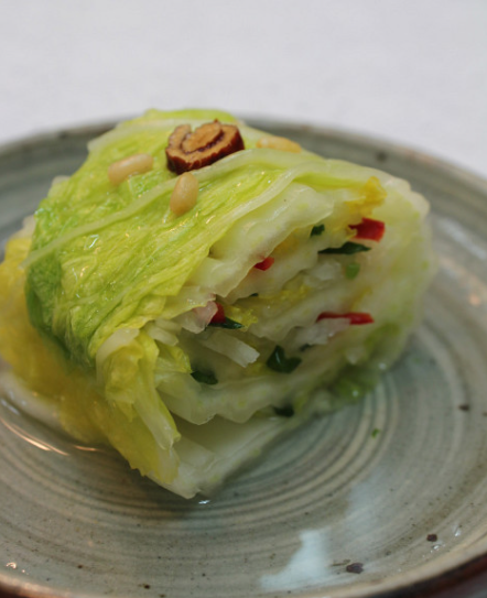 백김치는 배추를 통째로 소금물에 절여서 거기에 고추양념 대신 무채, 미나리, 잣, 배(과일), 마늘, 생강, 굴(어패류), 새우 등이 들어가는 편이다.