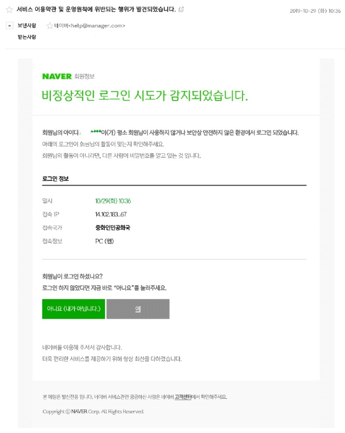 이 메일을 받은 제보자는 평소 네이버 계정에서 받는 메일과 같은 형식이었기 때문에 큰 의심 없이 내용을 확인했고 자신이 로그인한 내용이 아니라면 ‘아니요’를 누르라는 내용에 의심없이 ‘아니요’를 눌렀다.