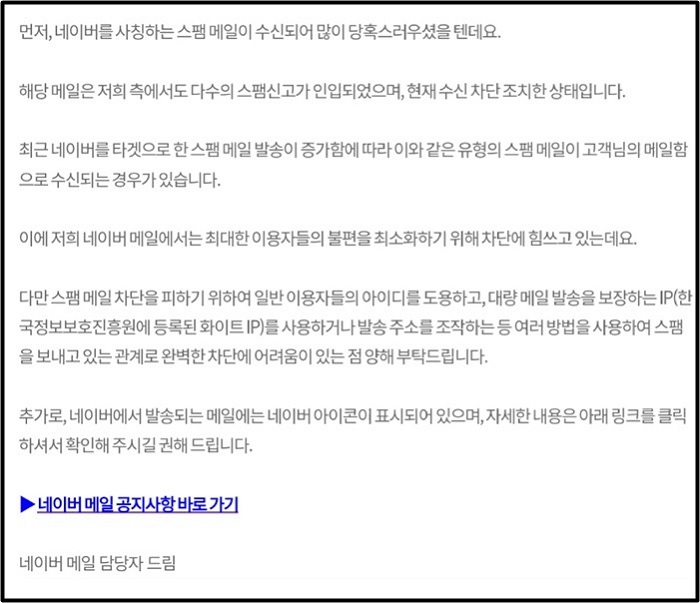 네이버 역시 공식적으로 보내는 메일 주소는 @help.naver.com 형식을 갖추며 공식 아이콘이 메일 옆에 뜬다고 밝혔다.