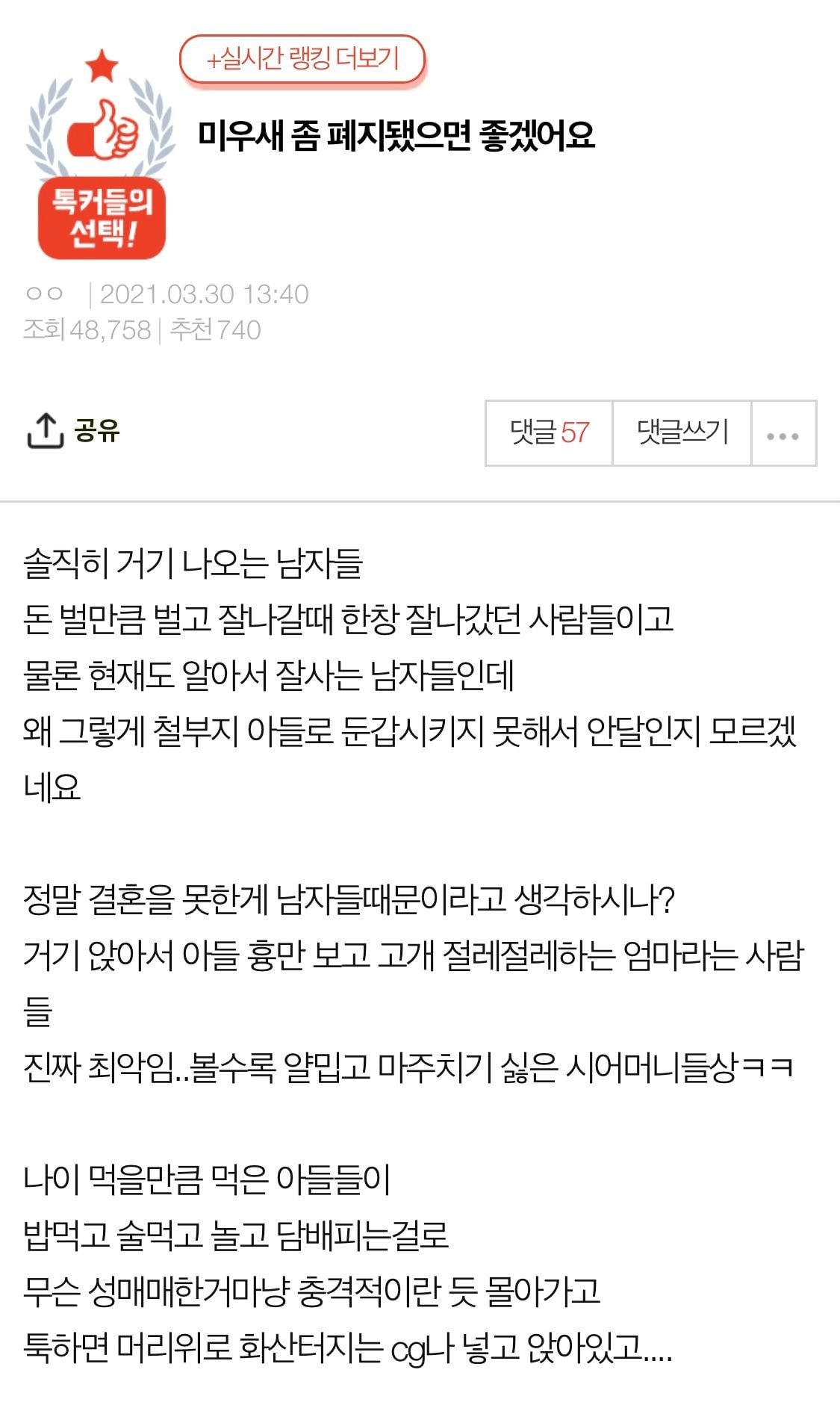 최근 온라인 커뮤니티에 올라온 “미우새 좀 폐지됐으면 좋겠어요”라는 제목의 게시글이 화제다.