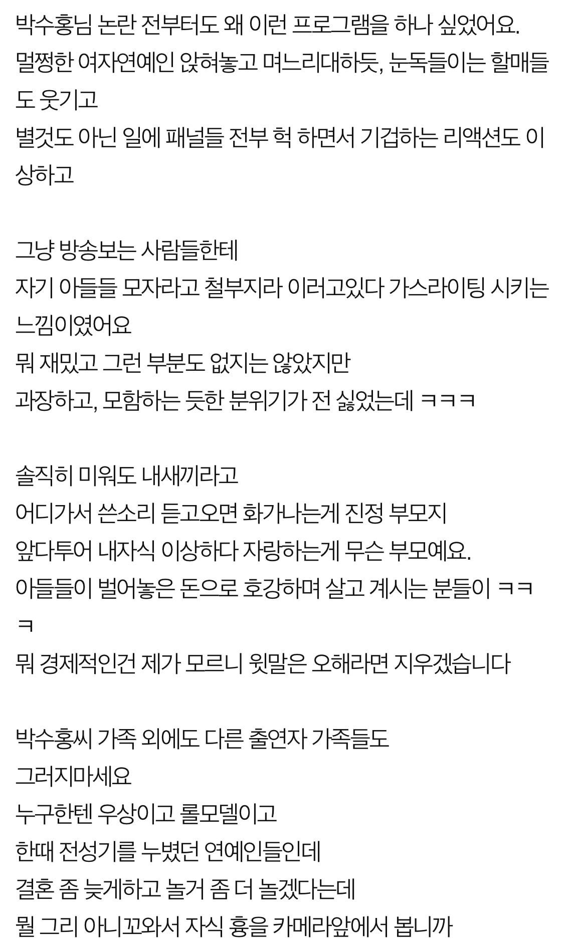 글쓴이는 “출연자들은 한때 잘나갔던 사람들이고 지금도 잘사는 분들인데 왜 철부지 아들로 둔갑시키는지 모르겠네요.”라며 이야기를 시작했다.