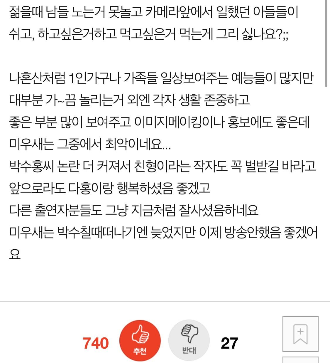 또 “다른 출연자분들도 그냥 지금처럼 잘사셨으면 좋겠습니다. 방송 안 하셨으면 좋겠어요 이미지만 나빠지는 것 같아요”라는 의견을 밝혔다.