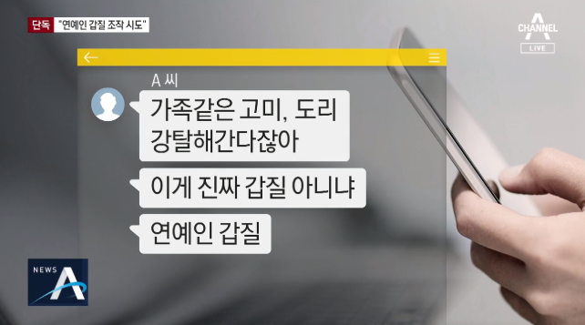 공개된 대화 내용에 의하면, A씨는 “(유승호가) 가족같은 고미, 도리를 강탈해간다. 진짜 갑질이다. 연예인 갑질”이라 한다.