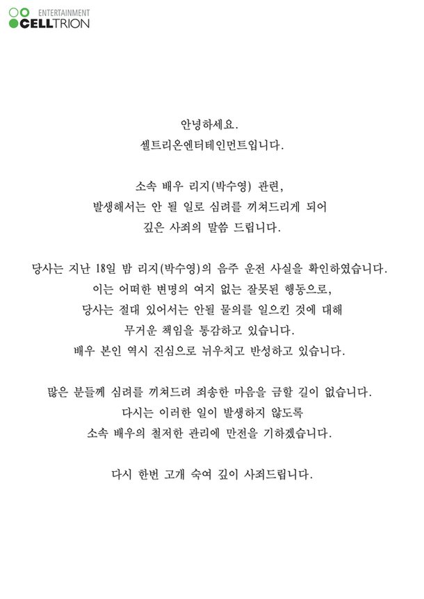 소속사 셀트리온엔터테인먼트는 19일 공식 입장문을 내고 “소속 배우 리지 관련 발생해서는 안 될 일로 심려를 끼쳐드리게 되어 깊이 사죄한다”며 “당사는 지난 18일 밤 리지의 음주운전 사실을 확인했다”고 밝혔다.