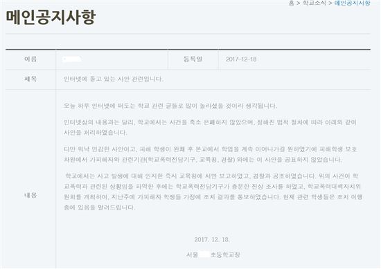 또 학교 홈페이지에 학교장 명의의 글을 업로드해 “사고 발생에 대해 인지한 즉시 교육청에 서면 보고했고, 경찰과 공조했다”고 밝혔지만 언론 보도 후 학교 측은 글을 홈페이지에서 삭제한 상태다.