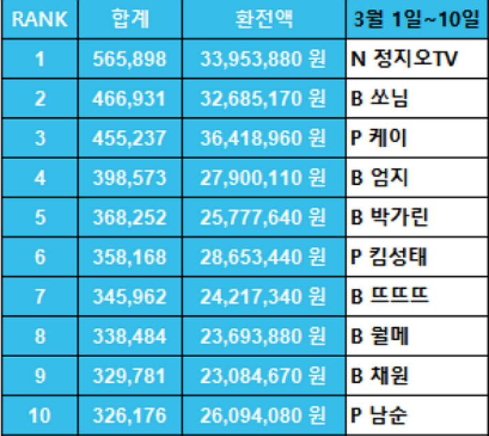지난 11일 온라인 커뮤니티 시디인사이드 인터넷 방송 갤러리에는 아프리카 TV의 BJ수입을 집계한 표가 게재되었다.