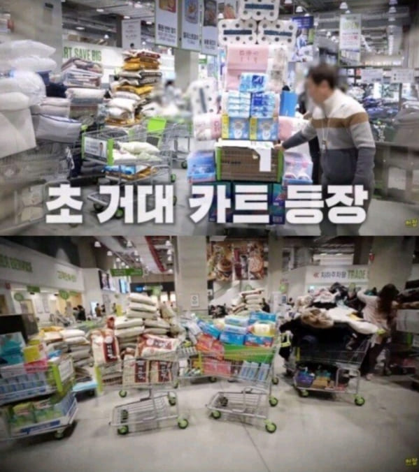 여러대의 카트가 가득차도록 물건들을 담았음에도 부족해 대형 카트까지 등장하기도 했다.