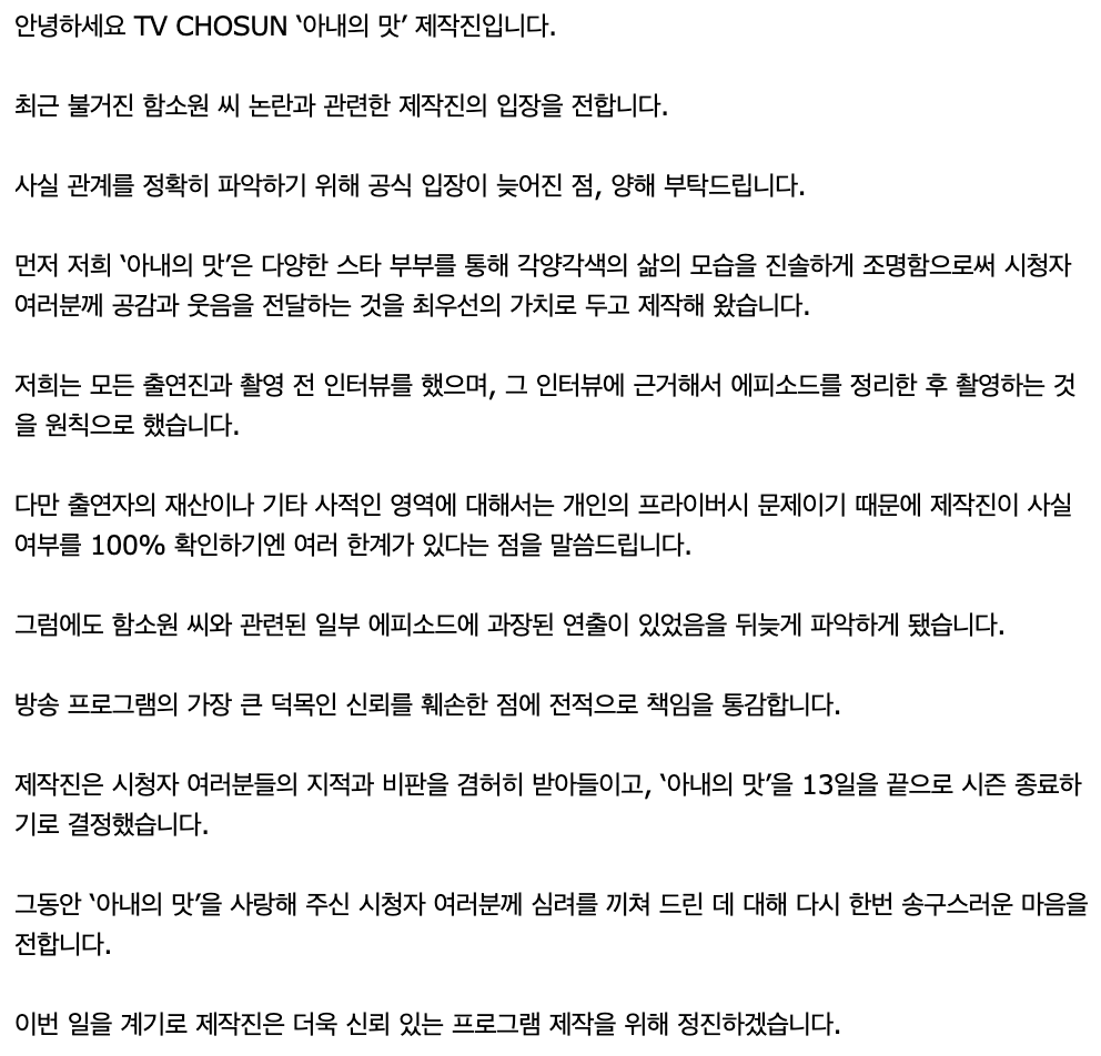 제작진은 “시청자 여러분들의 지적과 비판을 겸허히 받아들이고 ‘아내의 맛’을 13일을 끝으로 시즌 종료하기로 결정했다. 그동안 ‘아내의 맛’을 사랑해 주신 시청자 여러분께 심려를 끼쳐 드린 데 대해 다시 한번 송구스러운 마음을 전한다”며 글을 마무리했다.