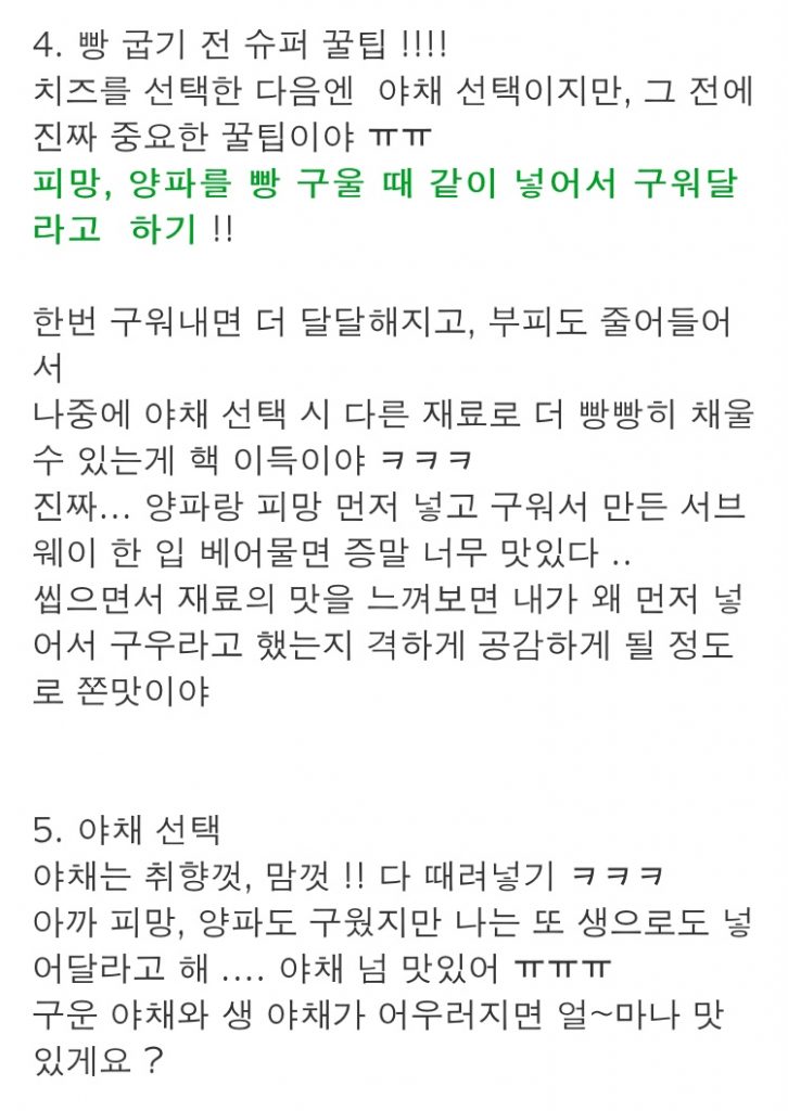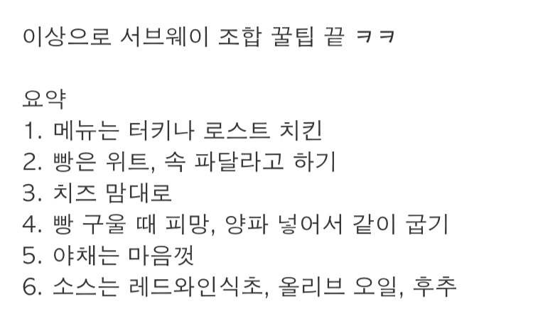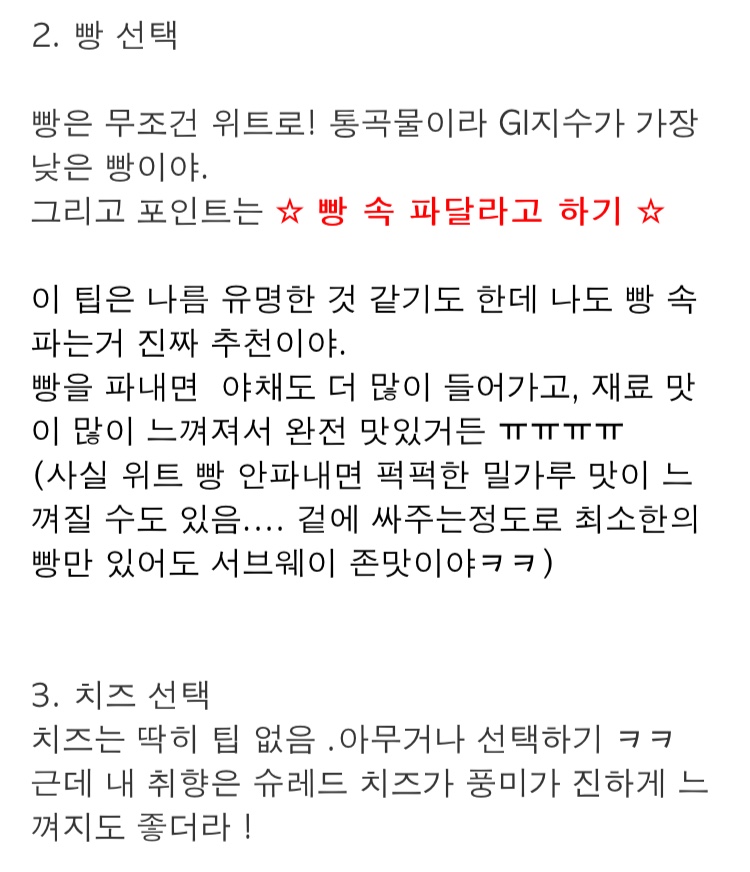 써브웨이 중독자라는 글쓴이는 수 많은 시행착오를 반복하며 직접 체득한 ‘써브웨이 꿀팁’에 대해 이야기했다.