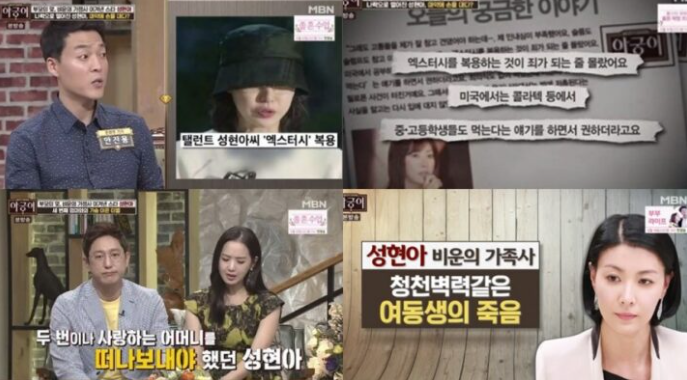 성현아는 엑스터시 복용 혐의가 들통나자 2명의 새엄마를 떠나보냈고, 화재로 잃은 여동생이 공개되면서 불우한 가정환경도 밝혀졌다.