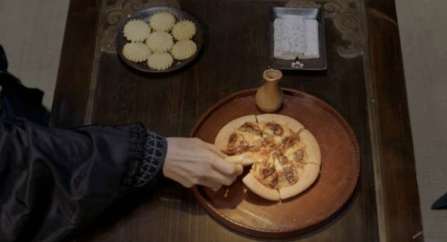 해당 게시물에는 중국 사극 드라마에서 한 중국 배우가 드라마 속에서 피자를 먹는 장면이 담겨져 있다.