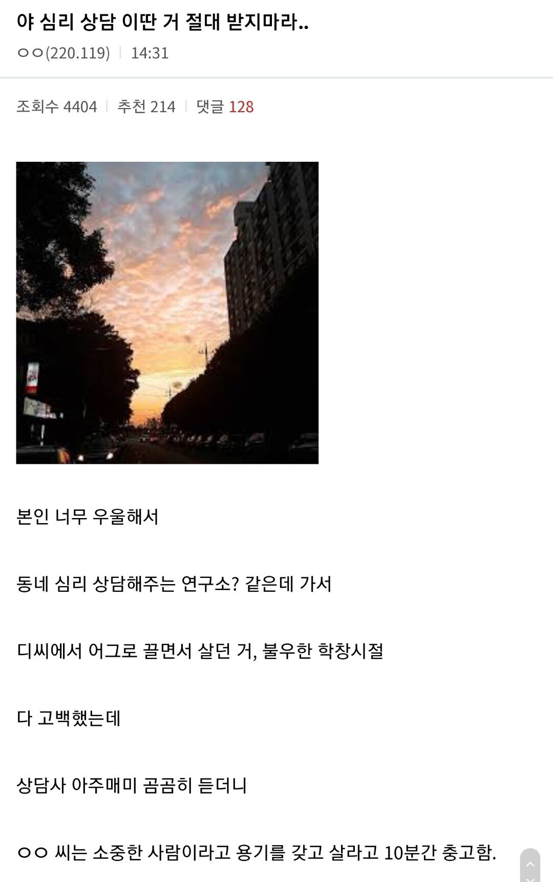 최근 온라인 커뮤니티에 올라온 “여러분들은 심리 상담 같은 거 절대 받으시면 안 됩니다.”라는 제목의 게시글이 화제다.