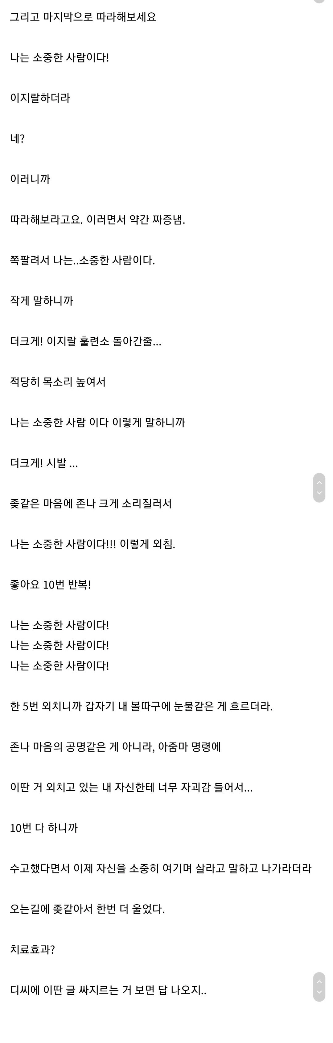 “그리고 마지막으로 나는 소중한 사람이라고 크게 소리치라 해서 소리치고 나왔습니다. 치료효과는 전혀 없었습니다.”라며 당시 상황을 전했다.