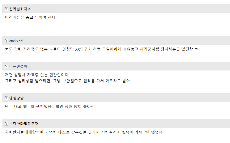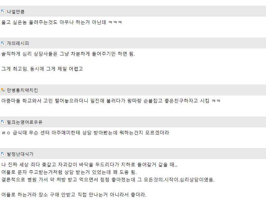 이를 본 온라인 커뮤니티 네티즌들은 “저도 상담을 많이 다녀봤지만 큰 도움이 되지 못했습니다. 그냥 정신과에서 약 처방받은 게 좋더라고요.”라는 반응을 보였다.