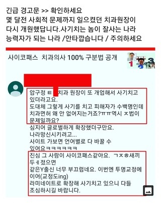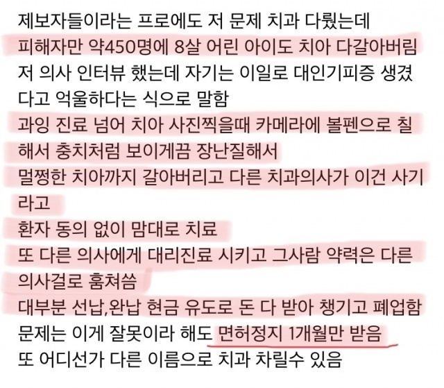 피해자는 “8월에 앞니 두 개를 레진 치료라고 해서 치아의 자국을 지우러 갔다”고 밝혔다.