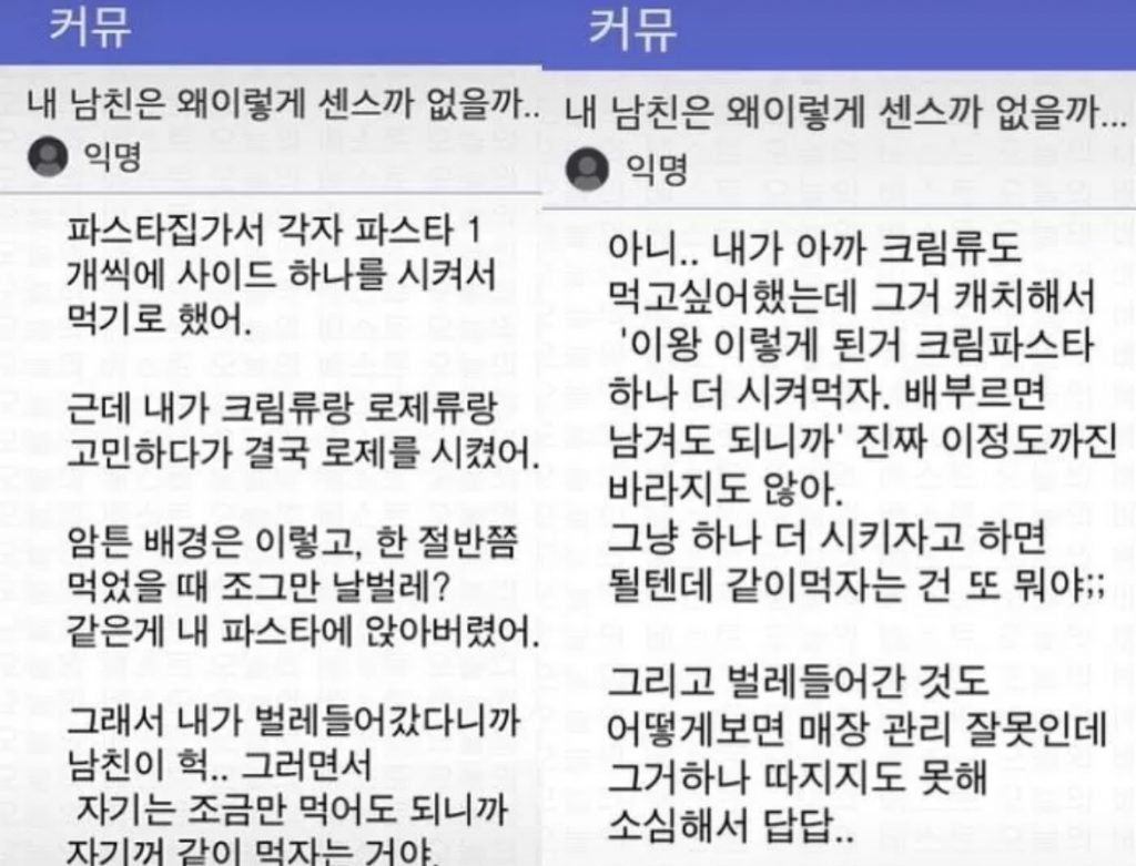 급기야 A씨는 ‘데이트 통장’을 언급하면서 “하나 더 시키는 게 자기 돈 나가는 거라 아끼려고 하는 건가 싶다. 남친의 다른 건 다 좋지만 센스가 아쉽다”고 말하며 글을 마쳤다고 한다.
