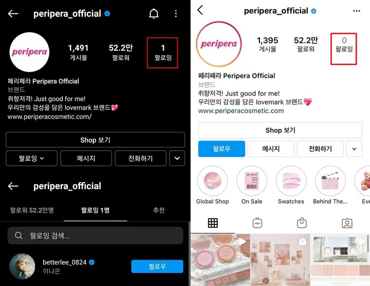 3일 페리페라 공식 인스타그램은 유일하게 팔로잉 하고 있던 나은의 계정을 언팔로잉을 하면서 동시에 약 100여 개의 게시물들을 삭제 처리했다.