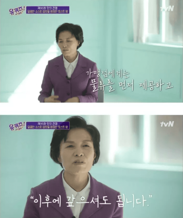 tvN 유퀴즈 온 더 블럭에는 지난 회차에서 이삭 토스트 김하경 대표가 출연해 기업에 대해 설명는데 방송에 따르면 이삭토스트는 3가지의 이유로 착한 기업 타이틀을 얻게 됐다고 한다.