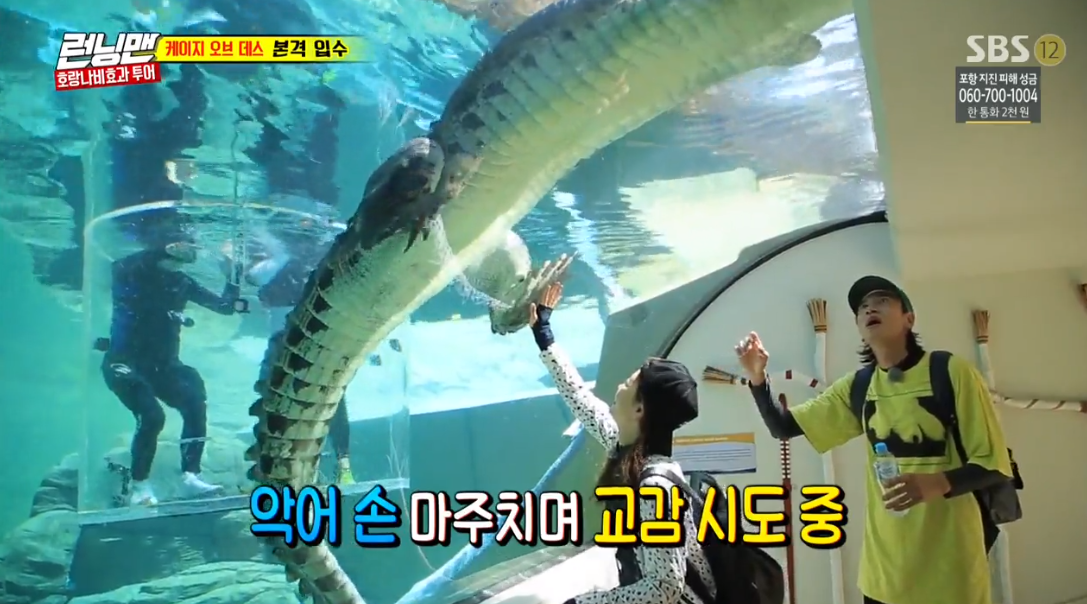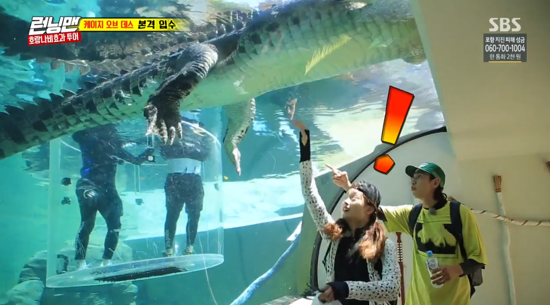 웃음을 참지 못하던 두 사람은 악어가 유재석, 지석진이 있던 케이지를 물려고 하는 걸 보자 다시 악어에 집중할 수 있었다.