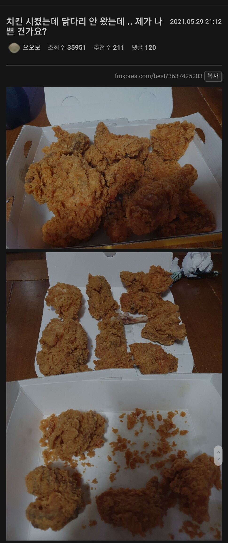 최근 온라인 커뮤니티에 올라온 “치킨 시켰는데 닭 다리 안 왔는데 제가 나쁜 건가요?”라는 제목의 게시글이 화제다.