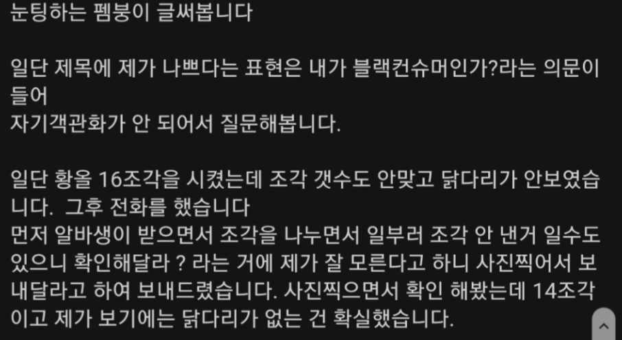 글쓴이는 “제가 치킨을 시켰는데 조각 개수도 맞지 않고 닭 다리가 보이지 않아서 항의 전화를 했는데요.”라며 이야기를 시작했다.