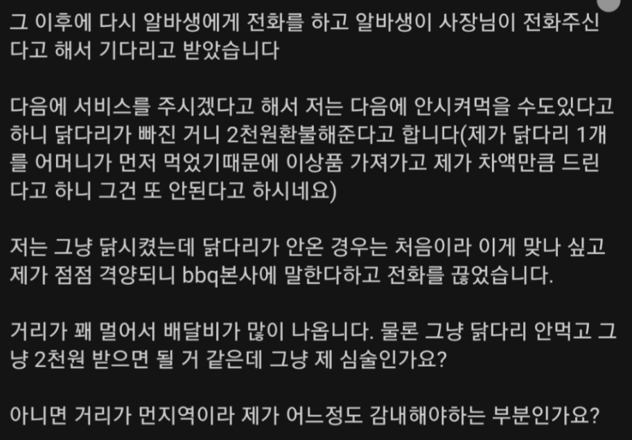 이어서 글쓴이는 “항의 전화를 하자 사장님이 닭 다리가 빠진 거니 2천 원 환불을 해준다고 하며 본사에 전화를 하겠다는 입장을 밝히셨습니다.”라고 말을 덧붙였다.