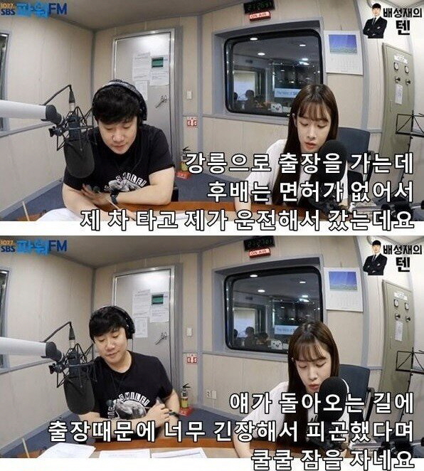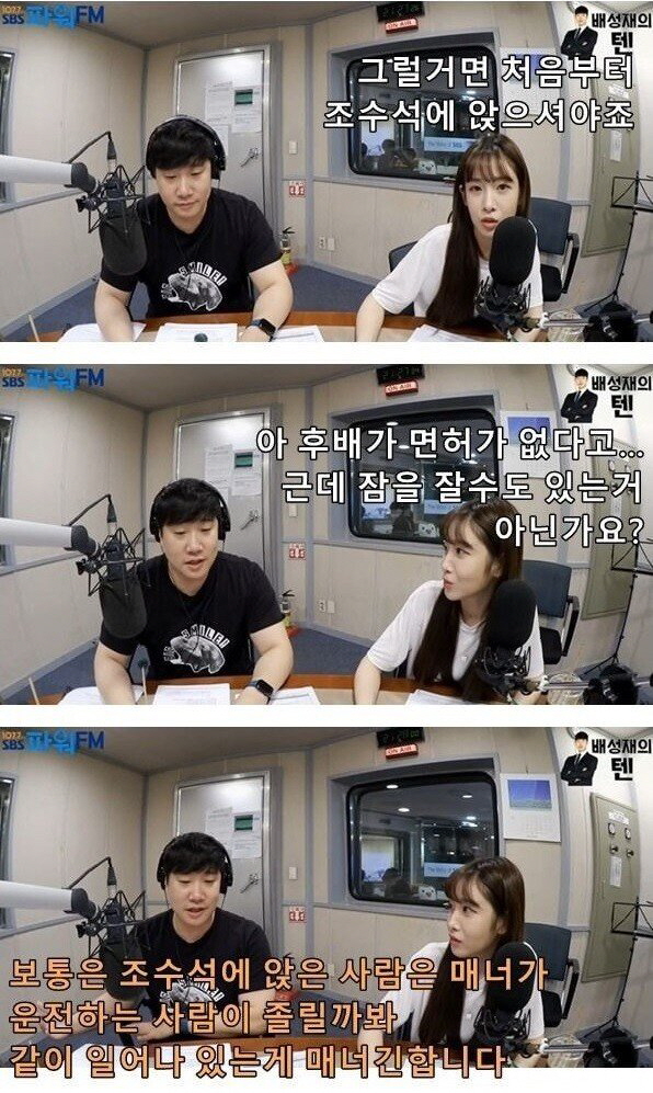 이에 방송인 배성재는 “보통은 조수석에 앉은 사람은 매너가 운전하는 사람이 졸릴까봐 같이 일어나 있는게 매너긴합니다.”라며 말을 이었다.