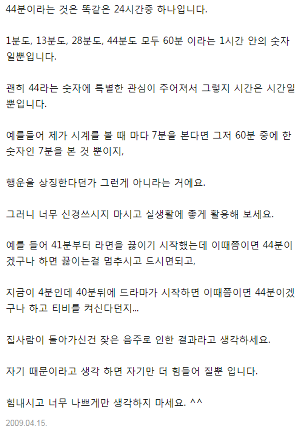 1. 시간을 볼때마다 44분을 봅니다.