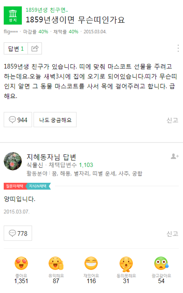다음 게시물들은 네이버 지식인에서 베스트로 뽑히는 기묘한 질문과 답변들이다.